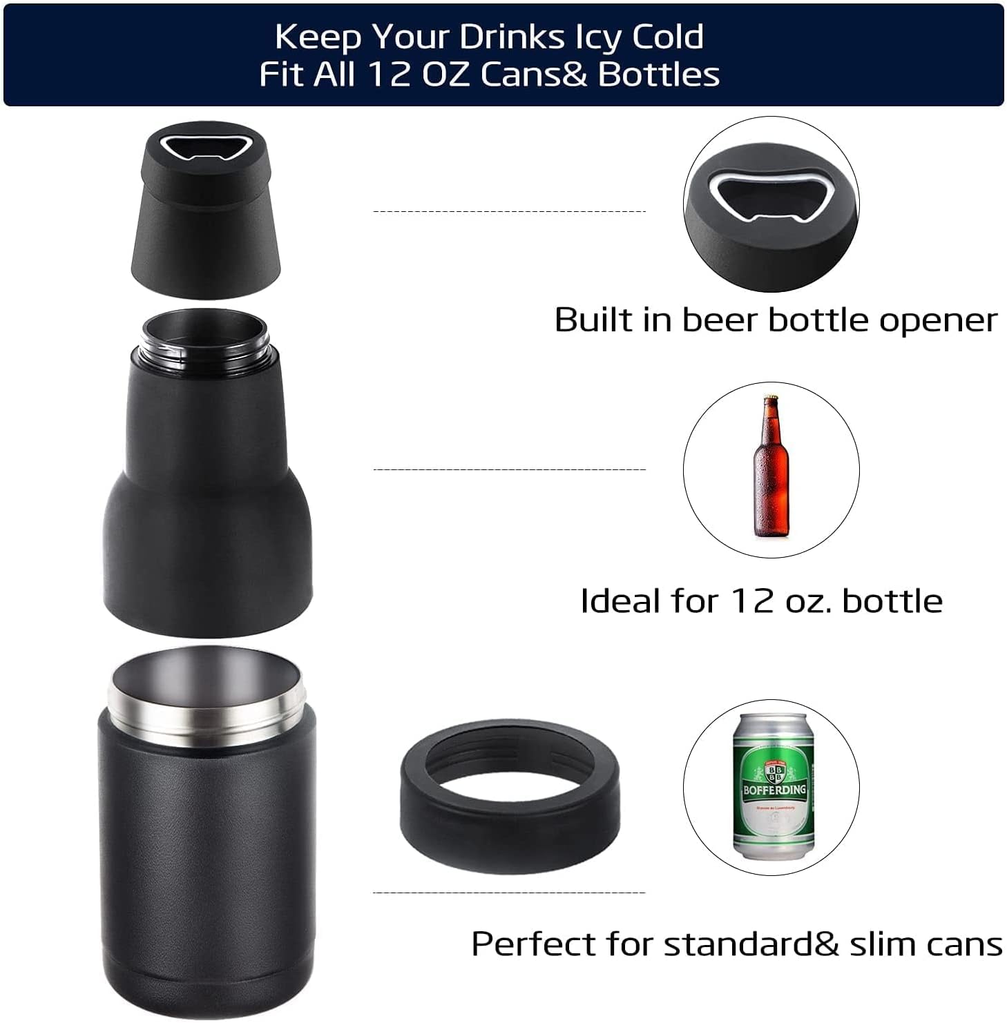 【Fits all 12 oz cans & bottles】The bottle cooler works with all slim-style 12 oz beer, soda canned drinks, spiked seltzers and energy drinks. With built-in beer bottle opener, it makes your beer drinking more convenient and enjoyable.