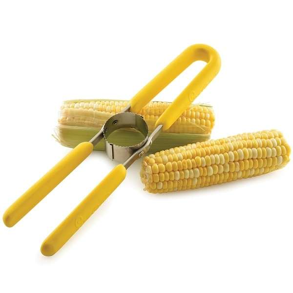 Cut off the bottom end of ear of corn so it stands flat. Slip the circular cutter over the end of the cob with the teeth facing down. Grasp the handles with both hands and push the cutter down the ear of corn.