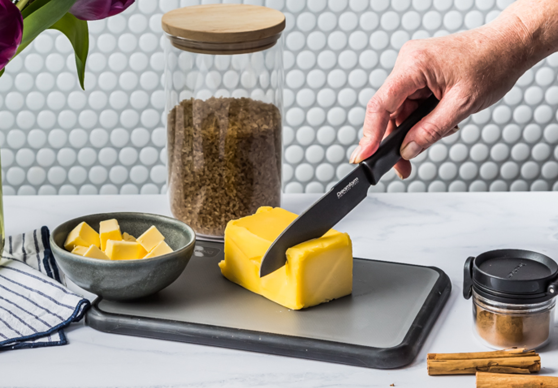 Fledge was designed to be your everyday board. It has food-gripping, knife-friendly patterns on both sides, and won’t warp in the dishwasher.